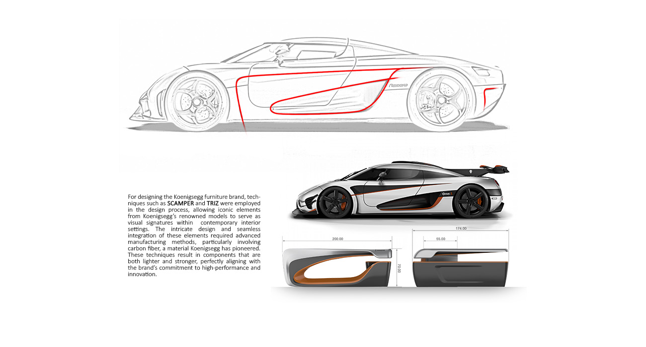 Super sports cars serve as an embodiment of desirability for individuals. Koenigsegg, a renowned Swedish brand specializing in super sports cars, is recognized for its innovative technology such as utilizing high-tech composite and carbon fiber material, which can also be applied to furniture to overcome production limits. Furthermore, after conducting a thorough analysis of all models and research in the furniture market, our aim was to bring the Koenigsegg brand identity and the desirability of a super sports car into users’ homes by designing an ergonomic, sleek-shaped chair named REGERA.